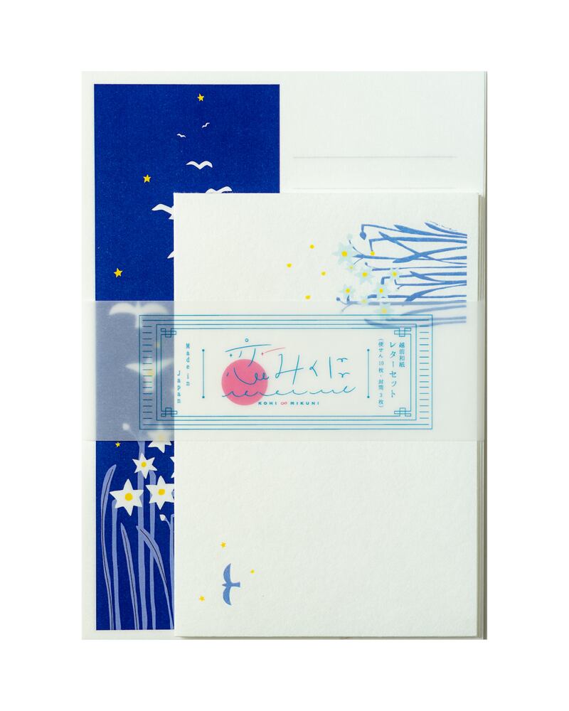 A letter set featuring the design of "Echizen narcissus and seagull" on Echizen washi paper.