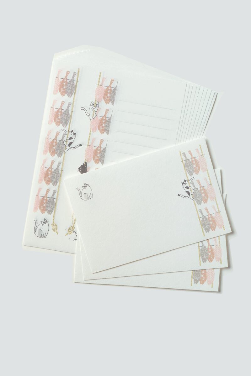 A letter set featuring the design of "Cats and dried sole" on Echizen washi paper.