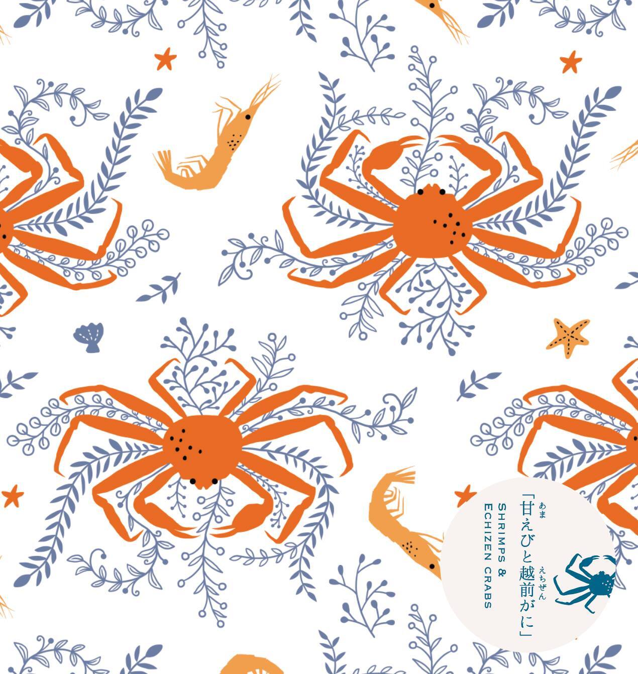 福井県坂市三国町には、越前がにをはじめとした海の幸で知られる三国港があります。冬の味覚の王者・越前がに、海の宝石と讃えられる甘えび。三國湊が誇る2つの特産品を模様にしました。福井の海の幸の贈り物に、お手紙を添えて送ってください。